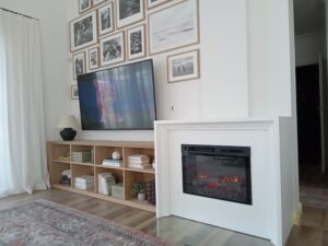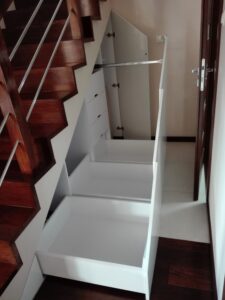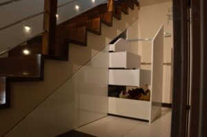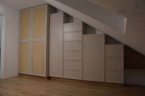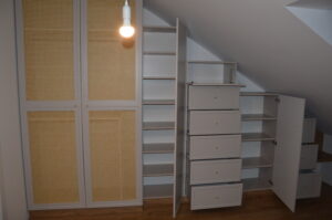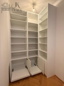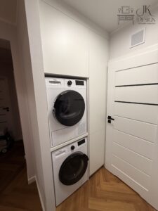 Wysoka biała szafa z frezowanymi lakierowanymi frontami i wyjeżdzającą szufladą tackową na drukarkę